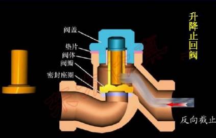 这种阀门的阀瓣沿着阀座孔的中心线移动,阀瓣靠流体的推力打开,靠重力落下,因此它只能安装在水平管道上。升降式止回阀的阀体形状与截止阀相似,因此它的流动阻力系数亦较大。