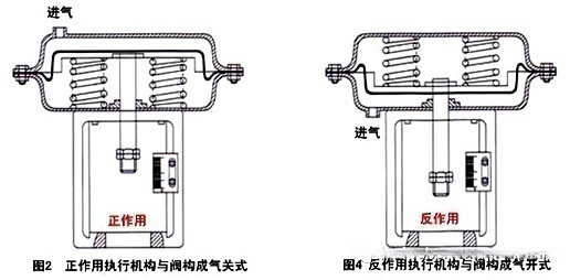 当气动执行机构的输入气压增加时,推杆向下运动,称为正作用;相反,输入气压增加时,推杆向上运动,称为反作用(见图),