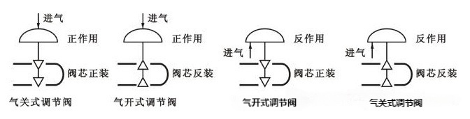 气动执行器有气开式和气关式两种形式。信号压力增加时阀开,称为气开式;反之,信号压力增大时阀关,称为气关式。由于执行机构有正、反作用,调节阀(具有双导向阀芯)也有正、反作用,因此气动执行器的气开或气关即由此组合而成,如图所示。