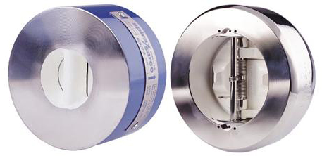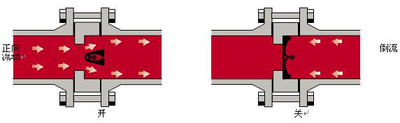 上图中蝶式止回阀由于扭弹簧的作用力通常阀门是关闭的,当流体正向流动时,流体的压力使得碟片绕铰链转动,阀门打开。一旦流体流动停止,由于弹簧的作用,在倒流前阀门就已关闭。