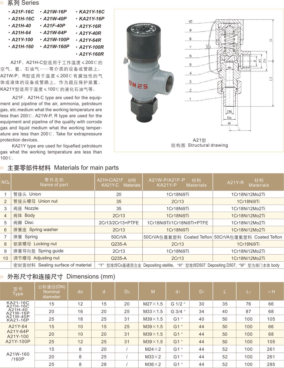 A21F、A21H-C型适用于工作温度≤200℃的空气、氨、石油气……等介质的设备或管路上。A21W-P、R型适用于温度≤200℃有腐蚀性的气体或液体的设备或管路上,作为超压保护装置。KA21Y型适用于温度≤100℃的液化石油气等。A21F、A21H-C型适用于工作温度≤200℃的空气、氨、石油气……等介质的设备或管路上。A21W-P、R型适用于温度≤200℃有腐蚀性的气体或液体的设备或管路上,作为超压保护装置。KA21Y型适用于温度≤100℃的液化石油气等。
