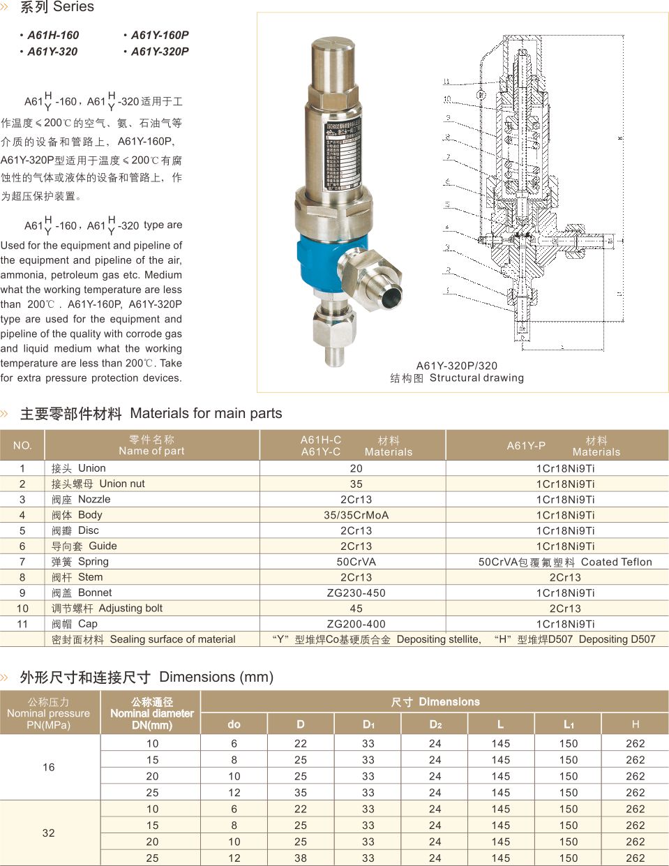 ≤200℃的空气、氨、石油气等介质的设备和管路上,A61Y-160P,A61Y-320P型适用于温度 ≤200℃有腐蚀性的气体或液体的设备和管路上,作为超压保护装置。